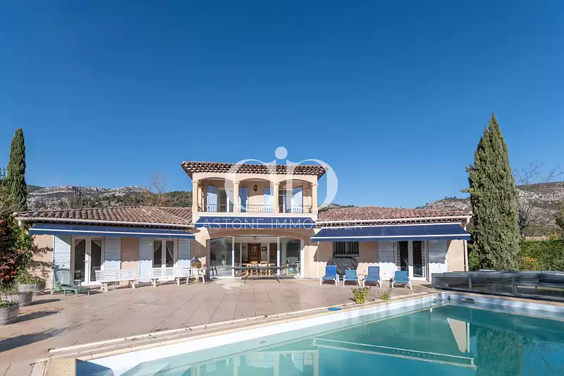 SOUS COMPROMIS - EXCLUSIVITE - PANORAMA EXCEPTIONNEL, LE CENTRE A PIED - très bien située à 7mn à pied du centre de Roquevaire, belle propriété avec une maison et une piscine en position dominante profitant d'une vue magnifique sur les collines avoisinantes, sur une superbe parcelle arborée de 3600m2.