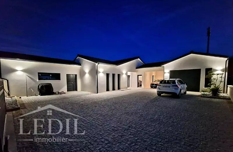 Elle se compose d'une entrée, d'une grande pièce de vie ouverte sur la cuisine aménagée, 5 chambres avec dressing, 3 salles d'eau, 2 WC, cellier, buanderie, garage 30 m² et carport 20 m², terrasse couverte 30 m², piscine balnéo, terrasses, pool house.