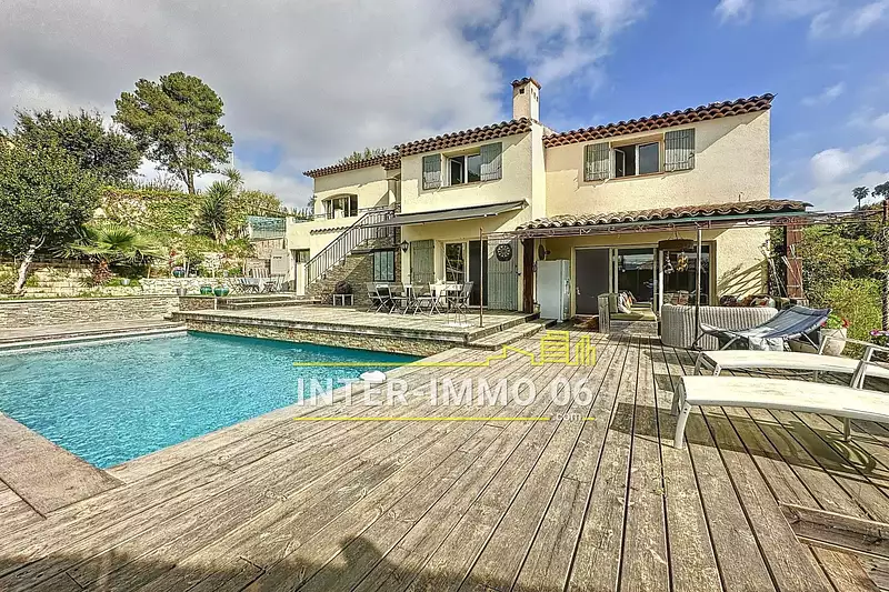 LA COLLE SUR LOUP, dans le quartier recherché et côté du Château de Montfort, superbe villa individuelle 7 pièces de 178m² habitables au CALME sur un terrain arboré de 1000m², EXPO SUD, au rez-de-jardin un vaste salon avec cheminée, séjour avec cuisine ouverte ouvrant sur une grande TERRASSE en bois avec PISCINE 8mX4m. A l'étage, 4 belles chambres avec rangements dont une en SUITE avec sa salle d'eau et son DRESSING, une salle de bains et un second dressing. Un appartement 2 pièces indépendant pouvant accueillir des invités ou être loué, un grand sous/sol de 70m² avec fenêtre pouvant être aménagé selon vos envies, un abri de jardin et parkings pour 5 véhicules. VERITABLE COUP DE COEUR !!!