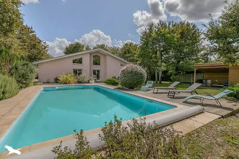 Maison à l'architecture chaleureuse avec son plafond cathédrale et ses beaux volumes. Située dans un environnement paisible, elle offre tout le confort nécessaire : grande cuisine équipée, buanderie aménagée, 4 chambres dont 1 suite parentale ( dressing et salle d'eau), carport, cuisine d'été, piscine. Terrain de 1.583 m². Proposition d'aménagement virtuel non contractuelle en dernière photo.