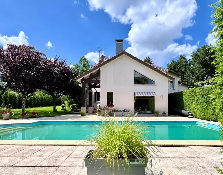 Maison d'architecte avec de beaux volumes – 4 chambres – Double garage – Terrain paysagé de plus 2000 m² avec piscine et dépendance.