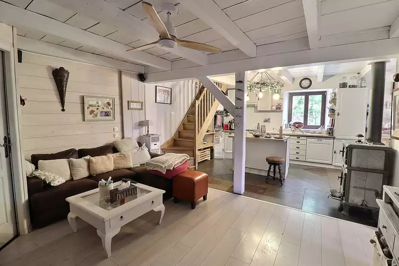 Au 1er étage, en duplex, la maison est composée d'une entrée s'ouvrant sur la pièce de vie avec un poêle à bois, d'une cuisine équipée, d'une chambre et de WC. À l'étage, l'espace nuit comprend 2 chambres, une salle de bains et des WC. À l'extérieur, une spacieuse terrasse couverte de plus de 70 m2 vous accueille pour de belles soirées.
