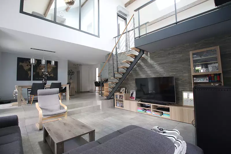 Maison en parfait état général de 8/9 pièces de type Sycomore rehaussée, 180 m² habitables, 211 m² utiles (hors garage), terrain 561 m², entrée, séjour cathédrale double avec poêle à granulés (Est/Sud), salle à manger, cuisine équipée et ouverte , 3 chambres dont une avec salle d'eau, bureau, salle de bain, wc séparés et garage double. A l'étage : mezzanine, 2 chambres, bureau, salle d'eau et wc. Fenêtres aluminium- Volets motorisés-Ballon thermodynamique, chauffage clim : PAC air/air- Parquet massif. Toiture avec isolation récentes 2021 . Réalisation d'une isolation thermique par l'extérieur . honoraires forfaitaires à la charge de l'acquéreur de 12.000 euros TTC (1.69 %) - 708.000 euros net vendeur (1.69 % honoraires TTC à la charge de l'acquéreur.)