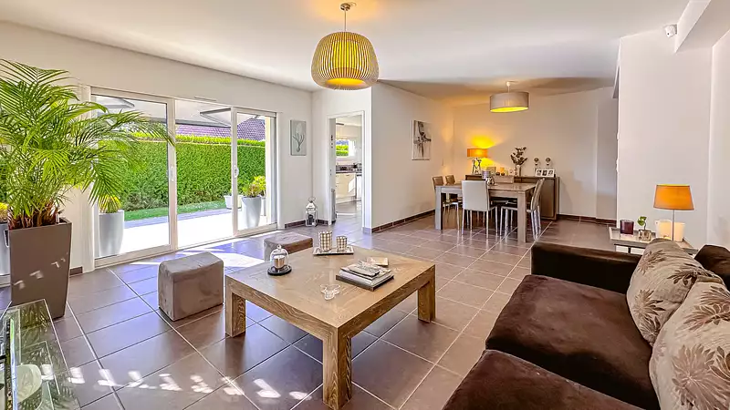 Dès l’entrée, un placard intégré facilite le rangement. Le vaste salon-séjour, baigné de lumière, s’ouvre sur une grande terrasse et un jardin. La cuisine séparée, aménagée et équipée dans un style moderne et élégant, offre un accès direct à la terrasse ainsi qu’à la buanderie et au garage. Une chambre de plain-pied avec salle d’eau privative complète ce niveau, idéal pour un confort de vie optimal.