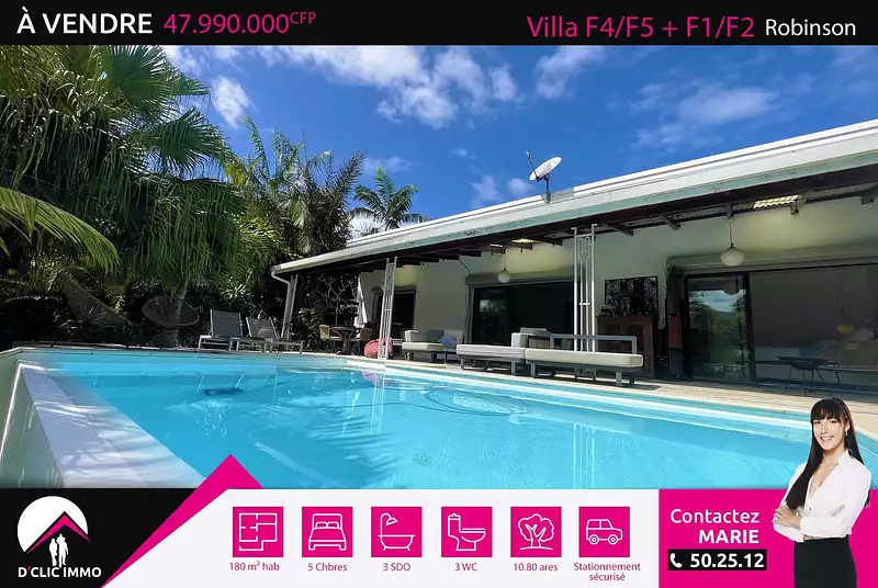 Idéalement située dans un quartier résidentiel calme de Robinson, au pied de la Bute Cornaille, à deux des commerces et de toutes commodités, avec superbe vue montagne, l'agence D'CLIC IMMO vous propose une superbe villa de plain pieds de type F4 + F2 en construction traditionnelle datant des années 1970 d'une surface habitable d'environ 180m² + terrasses + piscine à débordement, sur un beau terrain arboré de 10.80 ares.