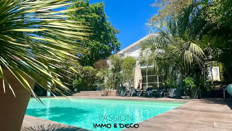 PYLA SUR MER. Sur 845 m2 de terrain clos, villa cossue traditionnelle, bardée de bois blanc. Elle offre une entrée desservant 3 chambres dont une suite parentale avec sa salle de bains privative, wc et dressing, une seconde salle d'eau avec wc, au niveau inférieur: seconde entrée, salle à manger avec cheminée insert, salon, cuisine américaine équipée avec cellier attenant, wc, buanderie et double bureau. A l'extérieur: terrasses, piscine, pool house, 4 ème chambre indépendante avec sa salle d'eau privative wc, et chalet en bois. Bien rare par sa vue et son environnement très verdoyant ! Retrouvez LIBELLULE sur notre site internet !