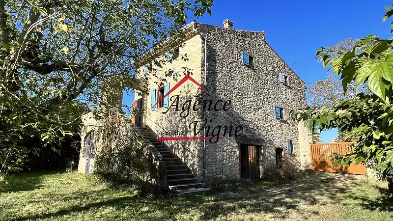 Bénéficiant d'une situation au calme, maison en pierres Mitoyenne sur l'arrière, sans vis à vis, composée au rez-de-chaussée d'une grande pièce voûtée avec coin cuisine de 41 m², une chambre, wc et à l'étage une habitation de 123 m² env. comprenant 4 chambres, salon avec cheminée insert, cuisine intégrée, salle à manger, bureau, salle d'eau et 2 wc, une très agréable et spacieuse terrasse en partie couverte avec belle vue dégagée sur la campagne environnante - Bon ensoleillement - Sur 3900 m² de terrain clos avec piscine 7x3 m - Coup de coeur...