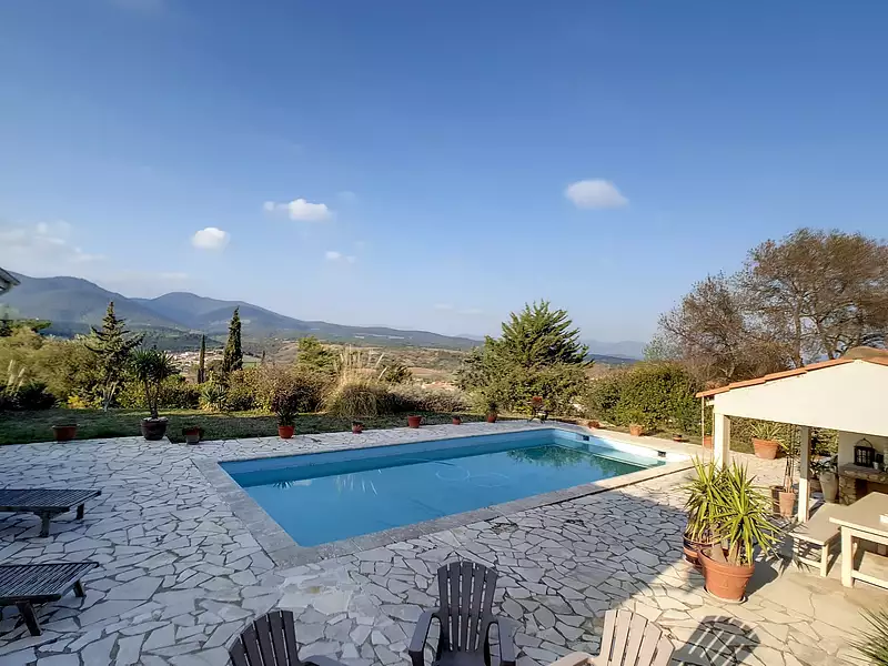 Sur les hauteurs de St Chinian, sur 3900m2, belle maison 6 pièces, terrasses, piscine, pool house, 2 grands garages, avec une vue à couper le souffle! Elle est composée en rez de jardin, d'un grand salon/salle à manger 60m2 avec cheminée et plafond cathédrale, cuisine, 2 chambres, salle de bains, wc, cuisine d'été/buanderie/cellier, garage, à l'étage 2 chambres donnant accés sur une terrasse, salle d'eau/wc, grand grenier. Toutes les pièces principales sont dirigées coté piscine ou coté montagne, la situation est exceptionnelle! Pool house avec barbecue, piscine 5X12, matériaux de qualité, possibilité de transformer un garage en gîte avec accés indépendant. Bien rare à la vente, maison coup de coeur, à visiter rapidement!