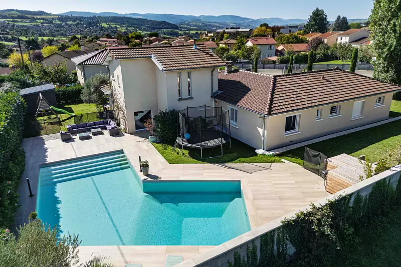 Côté extérieur, le terrain est clos et paysagé. Différents espaces invitent à la détente : terrain de pétanque, belle piscine, pergola et grandes terrasses.