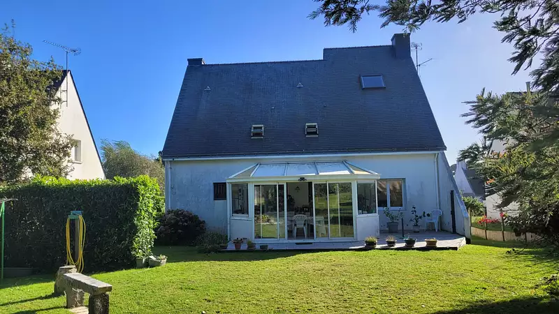 Rare sur le secteur de Saint Marc, maison familiale, quartier résidentiel, à 500m de la mer ( plage de la petite Vallée, Chemoulin et des Jaunais) sur beau terrain de 860m2, et 2km du centre bourg et célèbre plage de M. Hulot. Elle se compose, au RdC, une entrée, une grande cuisine aménagée-équipée et séjour double sur terrasse, exposition Sud, cheminée, une chambre avec placard, salle de bains et douche, un wc, une véranda sur jardin. A l'étage, 2 chambres avec rangements dont une avec balcon, une salle d'eau, un wc, un bureau. Sous combles, une 4ème chambre avec vue mer et un grenier de 40m2 aménageable. Grand sous-sol comprenant, cave, cellier, chaufferie, 2 places de garage (au total 90m2 environ). Contact tel : 06 81 21 17 32 (3.50 % honoraires TTC à la charge de l'acquéreur.)