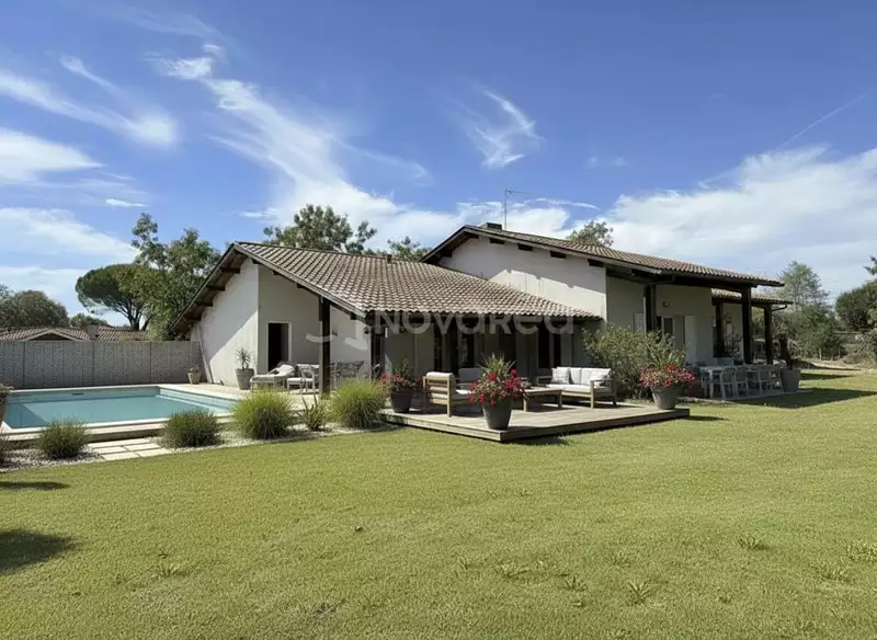 Côté nuit, trois chambres indépendantes, deux salles de bain et deux WC composent un agencement pratique et équilibré. À l'extérieur, un jardin arboré abrite une piscine et plusieurs coins de détente, parfaits pour profiter des beaux jours. Un double garage complète l'ensemble.