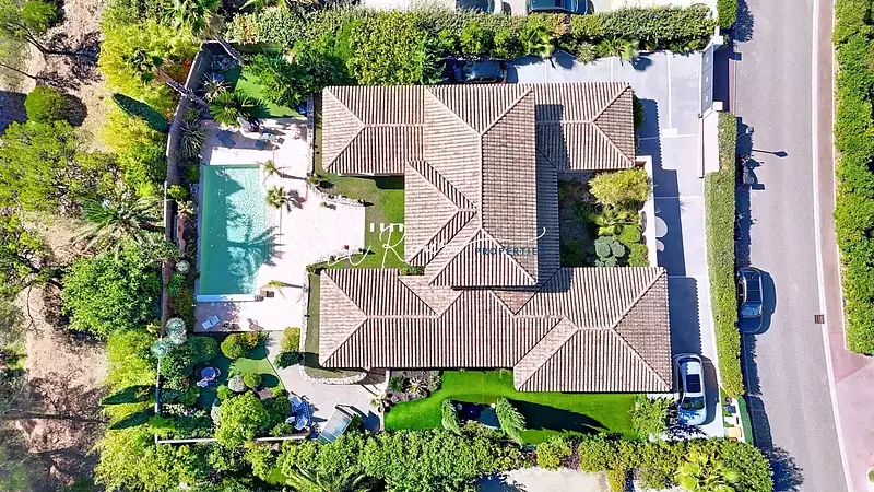 Au coeur d'un jardin méditerranéen ponctué de palmiers, la villa s'organise autour d'une somptueuse piscine prolongée de vastes terrasses et de deux salons d'été, véritables havres de détente.