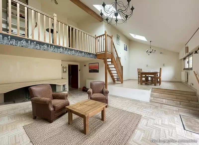 entrée, salle à manger- séjour cathédrale de 48 m² avec cheminée donnant un accès direct à la terrasse et au jardin, grande cuisine indépendante, 2 chambres, salle de bains avec douche, WC, dressing.