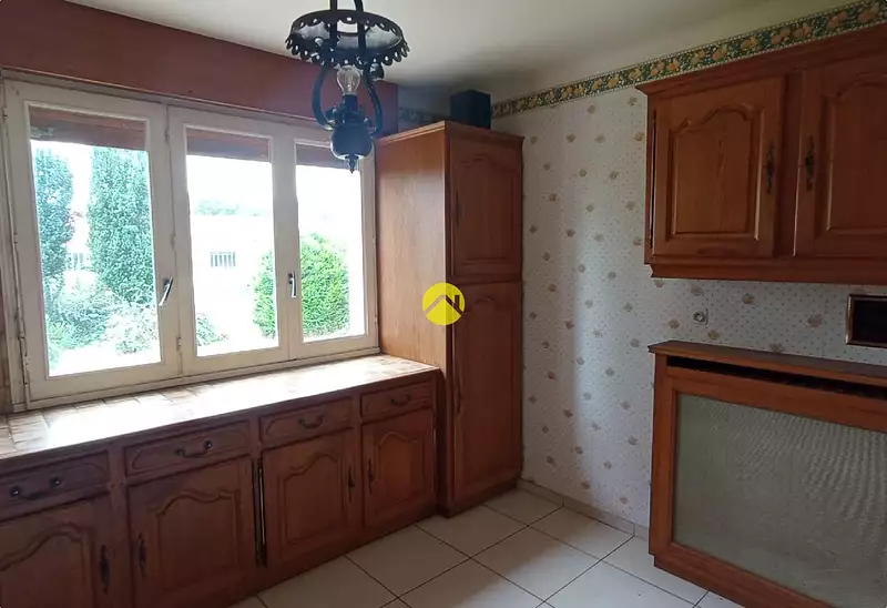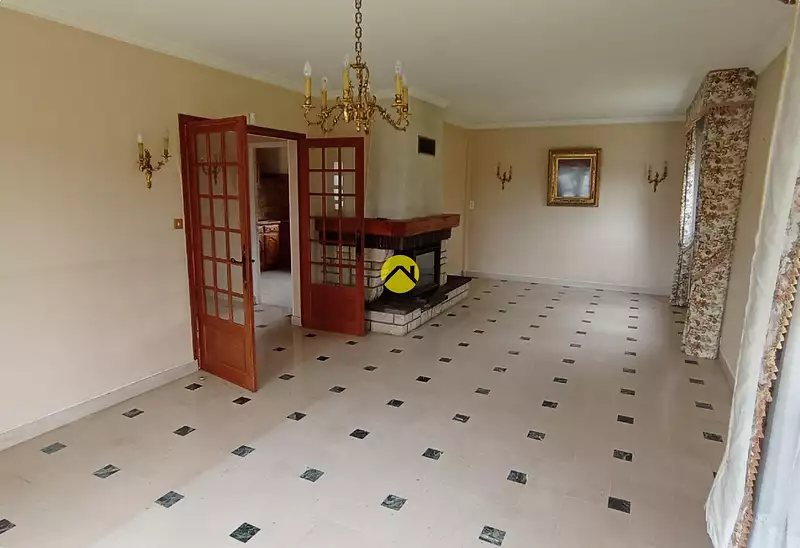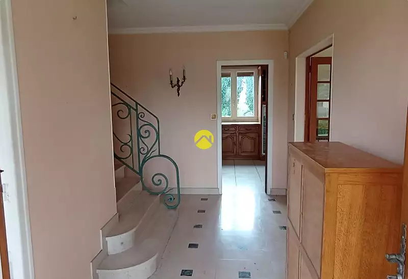 avec cheminée, Cuisine totalement aménagée, Salle de bain, WC, 3 chambres. Conduisant au 1er étage, un escalier
