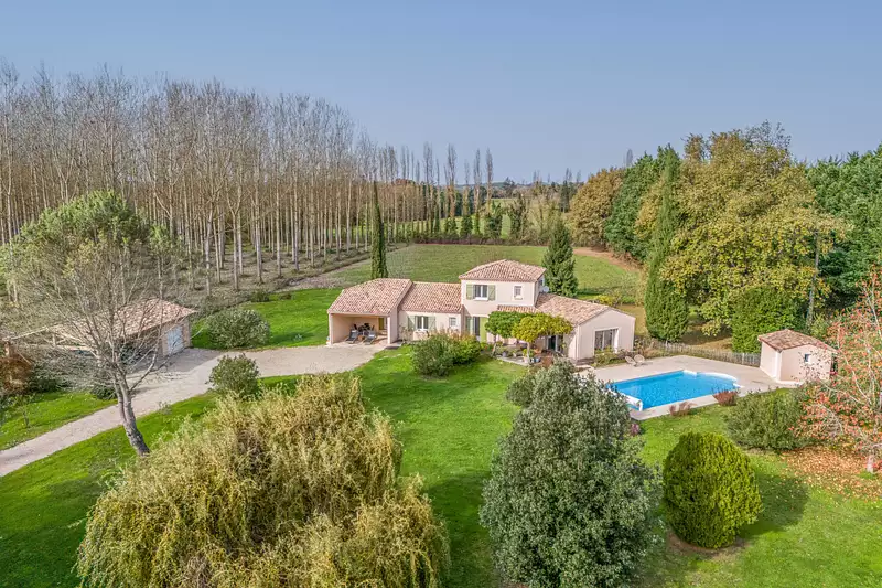 À quelques minutes en voiture du bourg historique de Villeneuve-sur-Lot, la maison offre un espace généreux et lumineux. Le grand espace de vie ouvert circule sans effort, ancré par une cuisine moderne super-stylée avec des appareils électroménagers intégrés. Le coin salon s'ouvre sur les jardins par de larges portes vitrées, créant un lien facile entre le confort intérieur et la tranquillité extérieure. Quatre chambres bien proportionnées et deux salles de bains contemporaines et élégantes complètent le logement principal, soutenu par une buanderie spacieuse et une chaufferie. La maison bénéficie du double vitrage et d'un système de chauffage efficace. pompe à chaleur Le chauffage à air pulsé est omniprésent, ce qui le rend aussi pratique qu'élégant.
