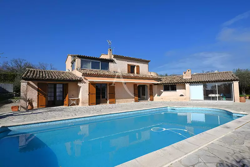 CHATEAUNEUF DE GRASSE - 35 mn NICE Aéroport et CANNES Riviéra - 20 mn SOPHIA ANTIPOLIS - villa d'architecte située en secteur privilégié très résidentiel et calme avec l'atout d'une belle vue verte, collines et mer sur la Baie de CANNES - Distribution des pièces - entrée avec escalier menant à l'étage - salon principal et intime espace avec cheminée et T.V. - cuisine indépendante donnant sur une véranda - 3 chambres et un bureau - 3 pièces d'eau et 3 toilettes - garage attenant - une dépendance séparée - L'ensemble de construction traditionnelle de qualité en bon état général nécessitant une mise au goût du jour avec un réel potentiel - Belle parcelle de terrain en terrasses de faible hauteur arborée d'oliviers centenaires - Points forts : excellente situation très résidentielle - ensoleillement d'est en ouest - parcelle de terrain plat tout en étant dominante - ?Les informations sur les risques auxquels ce bien est exposé sont disponibles sur le site Géorisques : www.georisques.gouv.fr'. Honoraires à la charge du vendeur .