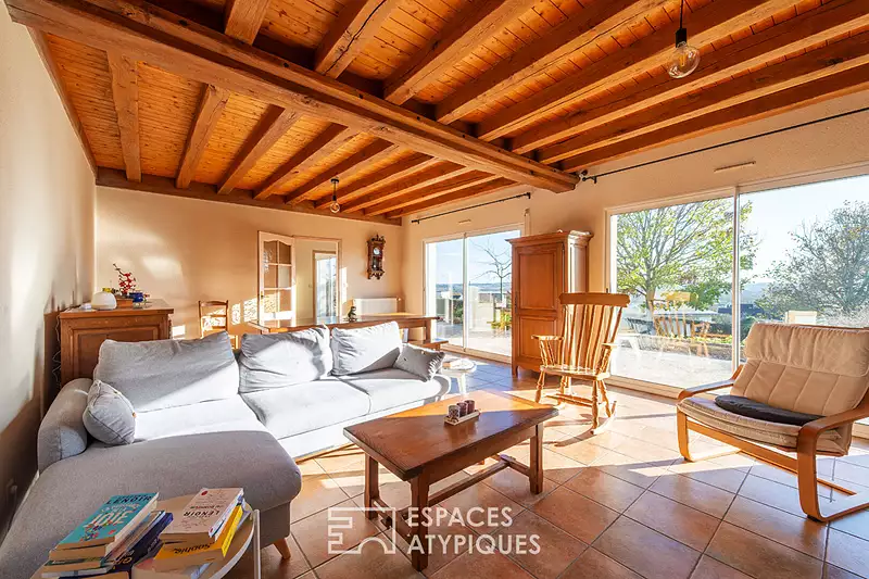 Cette maison de 1999 se situe sur les hauteurs de la commune de La Possonnière, village inscrit au patrimoine mondial de l'UNESCO. La propriété s'étend sur une parcelle de 2 265 m² et bénéficie d'une exposition plein sud, dans un cadre idéal pour ceux qui recherchent calme et larges horizons, à seulement dix minutes à pied de la gare TER du village. La maison, confortable et très lumineuse, développe une surface de 183 m² sur deux niveaux. Elle intègre au rez-de-chaussée une grande pièce de vie séjour-salon avec poutres apparentes, qui confèrent à cet espace un charme authentique. Elle est également agrémentée d'un poêle à bois et bénéficie de larges baies en aluminium offrant une vue époustouflante sur la vallée de la Loire. Une cuisine indépendante équipée communique directement avec une grande terrasse qui borde toute la façade sud de la maison. Une lingerie et un grand garage-ateliers complètent ce niveau, qui accueille aussi trois chambres, une salle de bains et un WC. L'escalier en bois, aérien, conduit à l'étage et ouvre sur un large espace mezzanine comprenant trois zones, puis une chambre, une salle d'eau, un WC et deux pièces de rangement qui enrichissent ce plateau. Les vues depuis l'étage sont tout aussi séduisantes. Particularité de cette maison : elle est rattachée à la souche d'un ancien moulin à vent, ce qui confère à l'ensemble une touche particulièrement surprenante et laisse entrevoir de belles possibilités d'interprétation. La propriété se situe à douze minutes à pied de la Loire et du circuit de la Loire à Vélo, permettant ainsi de profiter de belles balades le long du fleuve royal. Elle peut accueillir plusieurs voitures, grâce au garage, à un auvent en bois et aux nombreux espaces disponibles au sein de la propriété. Vingt minutes en voiture permettent de rejoindre Angers et douze minutes suffisent pour accéder à la gare d'Angers-Saint-Laud, Paris étant alors à seulement 1h20 en TGV. CLASSE ÉNERGIE : C/ CLASSE CLIMAT : C Montant moyen estimé des dépenses annuelles d'énergie pour un usage standard, établi à partir prix moyens des énergies indexés sur les années 2021, 2022 et 2023 (abonnements compris) : entre 2450 et 3370 euros. Contact (EI) : Philippe 06 07 60 57 50 Agent commercial immatriculé au RSAC Angers 349 740 936 RSAC Angers Les honoraires sont à la charge du vendeur. Les informations sur les risques auxquels ce bien est exposé sont disponibles sur le site Géorisques pour les zones concernées : www.georisques.gouv.fr.