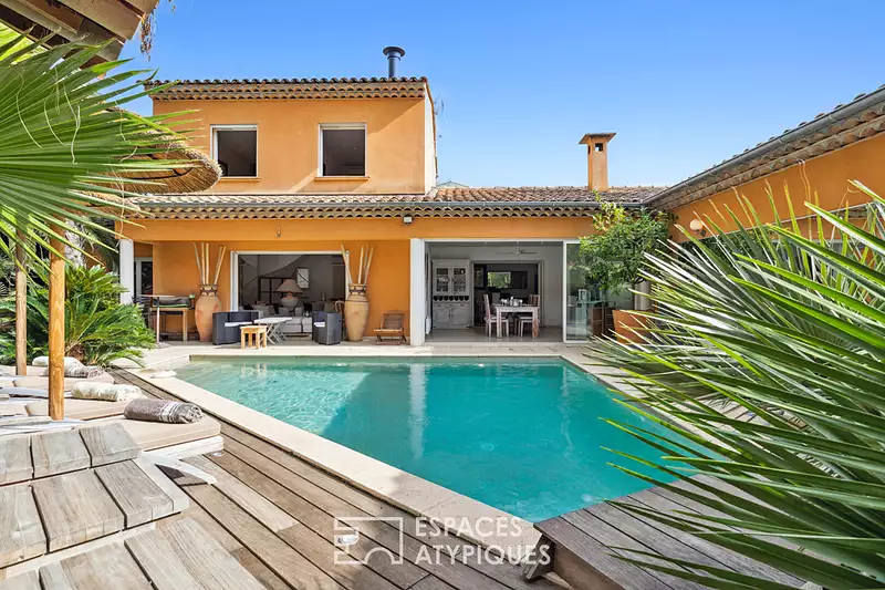 * Baisse de Prix* Nichée dans un quartier paisible et recherché de Sainte-Maxime, cette villa de charme offre une surface utile d'environ 180 m2 (110 m2 loi carrez) sur un terrain paysagé de 450 m2. Le rez-de-chaussée s'ouvre sur un vaste salon cosy, sublimé par une cheminée suspendue et baigné de lumière grâce aux grandes baies vitrées à galandage. Ces ouvertures offrent une vue imprenable sur le jardin balinais et la piscine chauffée. La cuisine ouverte, entièrement équipée, se fond harmonieusement dans l'espace de vie, alliant convivialité et modernité. La salle à manger adjacente, spacieuse et lumineuse, est idéale pour recevoir. La suite parentale, dotée de sa propre salle de bain et de toilettes privatives, assure confort et intimité. Ce niveau propose également un studio indépendant. Le sous sol révèle un espace détente et bien-être avec sauna, table de massage, et coin dédié au sport. A l'étage, deux grandes chambres avec placards se partagent une salle d'eau commune, apportant confort et fonctionnalité à cette villa d'exception. A l'extérieur, le jardin paysagé évoque les paysages tropicaux de Bali, avec sa végétation luxuriante et ses palmiers majestueux. La piscine chauffée et le jacuzzi promettent des moments de détente absolue. Un bar extérieur sous pergola, des transats et un espace lounge viennent parfaire cet environnement idyllique propice à la relaxation. Deux carports, pouvant accueillir jusqu'à quatre véhicules, sont également disponibles, renforçant la praticité de cette villa. Cette villa unique conjugue élégance moderne et atmosphère tropicale apaisante, à quelques minutes du centre de Sainte-Maxime. Un bien rare, parfait pour pour les amateurs de biens d'exception, à la recherche d'un cadre de vie atypique. CLASSE ÉNERGIE : C (118 kWh/m2/an) / CLASSE CLIMAT : A (3 kg CO2/m2/an). Montant estimé des dépenses annuelles d'énergie pour un usage standard entre 1400 euros et 1950 euros indexées aux années 2021, 2022 et 2023 (abonnement compris) Yolande KERHOAS - Conseillère RSAC 944 476 068 - Fréjus Copropriété de 2 lots - dont 2 lots habitation. Yolande KERHOAS (EI) Agent Commercial - Numéro RSAC : 944 476 068 - Fréjus.