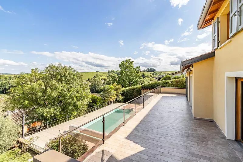 C'est le lieu idéal pour vous établir si vous souhaitez le calme, la vue et poser vos valises ! Une maison comme on n'en fait plus : il s'agit d'une construction traditionnelle avec de très belles hauteurs sous plafond, des pièces de vie spacieuses et lumineuses. La cuisine, le séjour et la salle à manger se poursuivent sur une immense terrasse suspendue qui vous permet de profiter d'un panorama imprenable et unique sur la chaine des Alpes et les collines environnantes. Vous disposerez au rez de chaussée, niveau des pièces de vie, d'une chambre avec une porte fenêtre lui permettant un accès indépendant et salle d'eau privative et d'une suite parentale avec son dressing, sa salle de bains dernièrement rénovée. Un bureau pour du télétravail est également prévu sur ce niveau permettant de faire une chambre supplémentaire si besoin. A l'étage il y a une chambre avec sa salle d'eau privative et un grand espace que les propriétaires ont laissé ouvert mais que vous pourrez à loisirs fermer ou transformer en chambre supplémentaire ou salle de sport. Amoureux de belles voitures ou de possibilités de rangement vous serez gâtés avec le sous sol complet. Légèrement décalé, l'espace piscine est un lieu de repos avec sa terrasse couverte et son espace sanitaire. Nul doute, vous serez charmés par cette maison de qualité : cour pavés, terrain clos, portail automatique, climatisation, volets électriques.... le tout à 12 mn de la gare de Villefranche et de l'A6, dans un village avec les commerces de proximité et le pôle médical. Contactez moi au 06 87 49 66 72 Sandrine pour une visite.