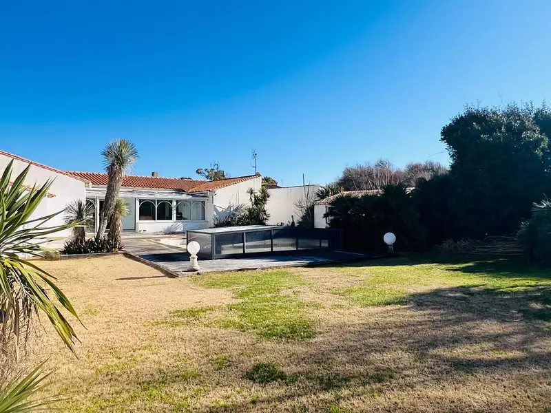 Belle construction pour cette villa de plain-pied, orientée Ouest, implantée sur un parc paysagé de plus de 1000m² donnant sur la plage.