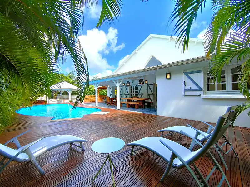 Vous y accédez par le niveau rez-de-chaussée en pénétrant par l'entrée qui dessert la cuisine, le cellier et son séjour de 33m2 spacieux et lumineux aux belles hauteurs sous plafond grâce à sa charpente traditionnelle. Un couloir vous permet d'accéder aux 2 chambres de ce niveau, aux 2 salles d'eau et au WC indépendant. La cuisine et le séjour sont ouverts sur la grande terrasse en L de plus de 50m2 prolongée d'une belle plage de deck qui entoure la piscIne, et d'un carbet favorable à de longues farnientes ombragées.