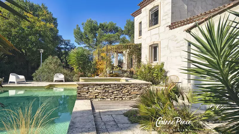 Environnement privilégié dans les collines de Nîmes se cache cette maison de style bastide d’une surface habitable d’environ 182 m2 sur une belle parcelle arborée d’environ 3 000 m2 avec sa piscine chauffée, son jacuzzi à débordement, son pool house et un très grand garage. Nous sommes sous le charme des volumes, des portes anciennes, des sols en pierre de Bourgogne et des poutres apparentes. Passez une belle porte d’entrée et découvrez le hall d’entrée, une vaste pièce de vie lumineuse donnant sur une agréable terrasse. Deux belles suites parentales dont une avec son accès indépendant un grand dressing et sa terrasse face à la piscine. A l’étage deux belles chambres et une salle de bain. Une maison de charme et de caractère avec tout le confort actuel, un vrai paradis !