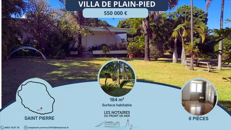 Chemin Bœuf, ravine des cabris, villa de plain-pied de 184 m² sur une parcelle arboré de 1542m².Située dans un quartier proche des commerces, banques et professions médicales, la villa comprend un séjour-salle-à-manger, une cuisine, une salle d'eau, trois chambres une suite parentale avec dressing et salle de bain., un bureau, l'ensemble est à rafraichir sans prévoir des travaux conséquents.Le jardin est piscinable et offre à l'arrière de la maison un dépôt d'environ 80m² ainsi qu'un parking couvert pouvant accueillir plusieurs voitures.PRIX: 500 000.00EUR ce non inclus les honoraires de négociation à charge de l'ACQUEREUR d'un montant de 20 000€ , soit 4% du prix de vente. Contactez Stéphane CARRERE au 0692.700 770. numéro de mandat : 215176; type de bien : Maison; nombre de chambres : 4; détails des pièces : séjour salle à manger 39.45 m², observation: parquet bois - Cuisine 22.72 m², WC 1.41 m², Salle de bains 17.38 m², Salle d'eau 11 m², Chambre 15.33 m², observation: avec placard - Chambre 13.70 m², observation: avec placard - chambre18 m², observation: avec placard - Suite Parentale 40.33 m², observation: dressing salle de bain - Bureau 5.37 m², ; Commune : SAINT-PIERRE;