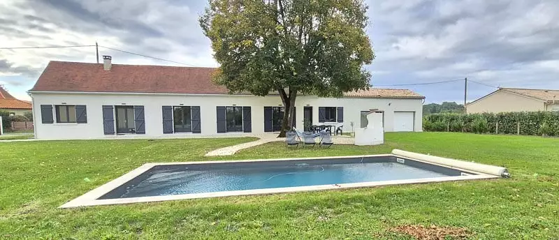 Dans un hameau de campagne calme, longère rénovée offrant de beaux volumes, piscine, sur un terrain arboré d'environ 1 ha. La maison comprend de plain-pied : entrée, cuisine équipée, salle à manger, salon avec cheminée insert, 4 chambres dont une suitée (salle d'eau/dressing), bureau, salle de bains, cellier, chaufferie, garage.