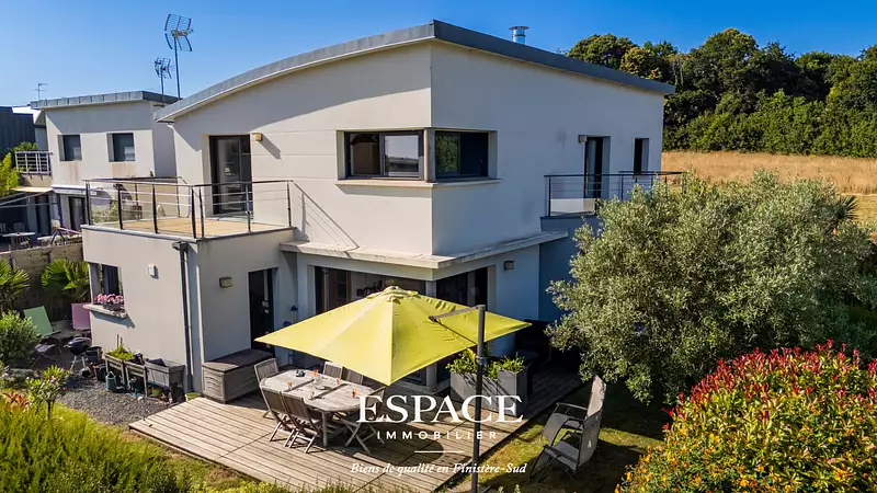 Près de la plage des Sables Blancs et du centre-ville, découvrez en exclusivité cette magnifique maison contemporaine située à seulement quelques pas de la mer, dans un quartier résidentiel prisé de Concarneau. Offrant une vie de plain-pied, cette propriété spacieuse de 185 m² saura séduire les amateurs de confort et de modernité. Dès l'entrée, vous serez charmé par une vaste pièce de vie lumineuse, agrémentée d'une cuisine semi-ouverte. Cet espace de vie bénéficie d'un accès direct à une belle terrasse, parfaite pour profiter des journées ensoleillées et des soirées en extérieur. A l'étage, la maison dispose de 4 chambres avec une vue dégagée jusqu'à la mer. Deux de ces chambres bénéficient d'une terrasse, offrant ainsi un espace intime et agréable. Vous trouverez également une lingerie, un espace de rangement. tous conçus pour optimiser l'espace de vie et le rangement. Les volumes généreux de cette maison sont rares sur le marché, tout comme son emplacement idéal. De plus, un grand garage de 38 m² vient compléter cette offre, garantissant un espace de stationnement ou de stockage supplémentaire. Ne manquez pas l'opportunité d'acquérir cette maison alliant modernité, confort et situation privilégiée. Ce bien vous est proposé à la vente en exclusivité par l'agence ESPACE IMMOBILIER, spécialiste des belles maisons et des beaux appartements en Finistère Sud. Contactez-nous dès aujourd'hui pour programmer une visite. Les informations sur les risques auxquels ce bien est exposé sont disponibles sur le site Géorisques : [www.georisques.gouv.fr](http://www.georisques.gouv.fr). (4.03 % honoraires TTC à la charge de l'acquéreur.)