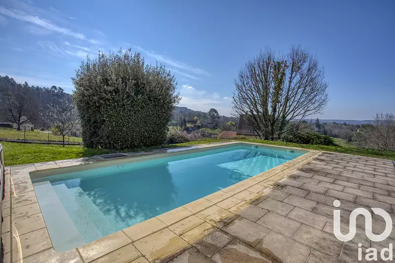 iad France - Anne FOUQUET vous propose: Sur les hauteurs, avec vue imprenable sur la Bastide de DOMME, maison d'architecte contemporaine, très soignée et fonctionnelle, proposant au rez-de-jardin : agréable pièce de vie très lumineuse donnant sur cuisine ouverte et jardin d'hiver (climatisation réversible), 2 chambres, dont une avec dressing, salle de bain/douche, WC séparés, cellier/buanderie. À l'étage, dégagement, 3 chambres, salle d'eau et WC. Piscine couverte au sel. Garage. 2 Carports. Récupérateur d'eau pour alimentation des WC, lave-linge et arrosage jardin. Classe énergétique B. Double vitrage (bois chêne intérieur et aluminium en extérieur). Chauffage au sol par géothermie (2 niveaux) et aérothermie pour la véranda. Assainissement collectif. Terrain de 4.800 m2 entièrement clos. Exposition SUD/EST.
