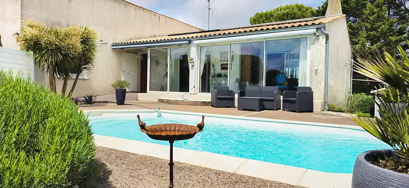 Vous constaterez, dès l'entrée, que la maison possède de beaux volumes et qu'elle est lumineuse. La pièce de vie fait environs 60 m² prolongée par une véranda qui donne sur une terrasse et la piscine.
