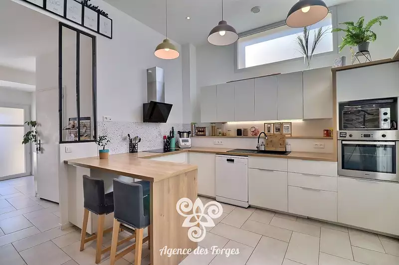Située dans le bourg de Mouzillon, grande maison familiale d'environ 185m² offrant au rez-de-chaussée : une grande entrée d'environ 14m² - une belle cuisine aménagée et équipée (four-plaque-hotte) d'environ 15m² - un vaste séjour de 43m² avec baie vitrée et nombreux rangements - une buanderie - un wc indépendant - une cave et un garage d'environ 23m². A l'étage : un grande pièce palière de 29m² (salle de jeux, bureau...) avec accès extérieur - 3 premières grandes chambres (dont 1 avec espace dressing) - une salle d'eau (douche et double vasque) - un wc indépendant - un 1er bureau - une chambre parentale d'environ 19m² avec espace dressing et salle d'eau privative (douche et vasque) et un second bureau d'environ 9m² avec terrasse. Le tout sur une parcelle de jardin de 573m² avec terrasse. Double vitrage - Pompe à chaleur 2025 (nouveau DPE en cours) - Tout à l'égout... (3.14 % honoraires TTC à la charge de l'acquéreur.)