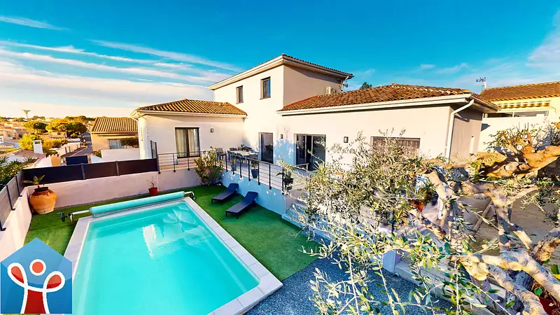 Votre Agence Nouveau Propriétaire vous présente en exclusivité : À Portiragnes village, découvrez cette villa familiale 4 faces avec piscine, garage et prestations haut de gamme. Située dans un environnement résidentiel calme et recherché à proximité du centre à pied, cette maison contemporaine de 2009 séduit par ses volumes généreux, sa luminosité et ses équipements pensés pour le confort au quotidien. D'une surface habitable d'environ 185 m², elle offre un séjour de 75 m² avec cuisine ouverte équipée, un cellier/buanderie et une salle à manger. Parfaitement agencée, elle dispose d'un espace bureau, de 5 chambres, dont une suite parentale en rez-de-chaussée avec dressing et salle de bains balnéo, ainsi qu'une deuxième chambre avec salle d'eau et wc privatif. L'étage accueille trois chambres spacieuses, une salle de bain et un WC, idéal pour l'espace enfants ou invités. Le confort est au rendez-vous avec climatisation gainable réversible, menuiseries alu double vitrage à galandage et volets roulants électriques. La parcelle de 615 m² est entièrement aménagée avec soin : piscine au sel 7x3,50 m, terrain de pétanque, pelouse synthétique, terrasse carrelée, garage en sous-sol de 68 m², et stationnement pour 4 véhicules. Cette villa offre un cadre de vie rare à quelques pas des commerces, écoles, animations, et transports. Prix TTC et Honoraires à charge vendeur TTC Agence Nouveau-Propriétaire - 04 99 47 52 51 - Plus d'informations et visite virtuelle sur le site sur le site (réf. 345882253)