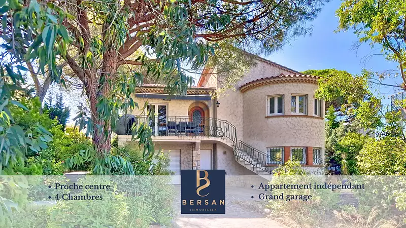 Votre agence BERSAN Immobilier vous propose en EXCLUSIVITÉ cette villa située proche du centre-ville de Saint-Raphaël, offrant de beaux volumes, un appartement indépendant et un cadre de vie paisible à proximité des golfs, commerces et plages. Dès l'entrée, la maison accueille une salle à manger attenante à un vaste séjour. La cuisine indépendante et équipée ouvre directement sur une terrasse conviviale. L'espace nuit comprend quatre chambres dont une avec salle d'eau privative, une salle d'eau supplémentaire rénovée et deux toilettes indépendants. Le rez-de-jardin propose un appartement T2 indépendant de 65 m² comprenant un grand salon avec salle à manger, une chambre, une cuisine et une salle d'eau, idéal pour recevoir ou envisager un projet locatif. La propriété repose sur un terrain arboré de plus de 800 m² et bénéficie d'un grand garage pouvant accueillir deux véhicules. L'équipe BERSAN Immobilier reste à votre disposition pour toute information complémentaire ou pour organiser une visite. Une visite virtuelle Live est disponible sur demande.