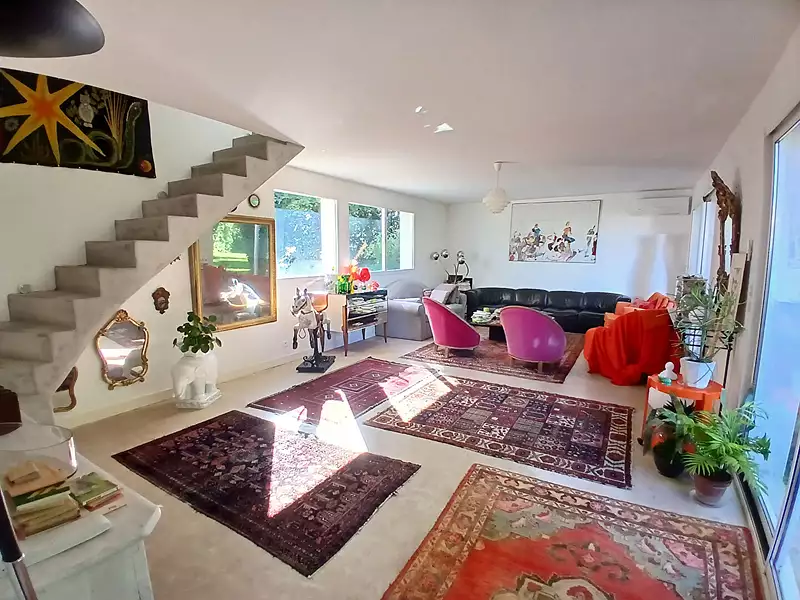 Tout proche de Royan et à moins de 5km des plages et à 3km du centre et de ses commerces , BIEN IMMO vous présente cette surprenante MAISON/VILLA située à ST SULPICE DE ROYAN. Implantée sur 4097m² vous apprécierez son environnement bohème et verdoyant, sans vis-à-vis, La maison des années 60 s'est agrandie et enrichie au fil du temps, en 1982 ,1989 et 2010 et propose désormais une maison atypique de 185m² avec un garage à chacune de ses deux extrémités. Elle comprend une entrée très lumineuse desservant deux ailes distinctes dans un environnement au charme certain et naturel . A droite on retrouve un salon/salle-à manger avec un comptoir bar 36m² et cheminée, sdeau avec wc, bureau en mezzanine, dégagement vitré avec vue imprenable sur la terrasse et le parc, cuisine eq/am très lumineuse et donnant sur terrasse exposée sud, deux chambres avec salle de bains commune. L'aile gauche dévoile un séjour 37,5m² climatisé, baigné par la lumière et avec vue et accès sur le parc. Un escalier en béton brut mène à l'étage qui dessert l'espace nuit avec wc, salle d'eau, chambre et suite parentale avec dressing et espace bureau. PVC double vitrage sur la plupart des menuiseries, chauffage électrique, clim dans séjour et cheminée. 595000 euros HAI avec Hors Honoraires 577670 euros et Hon Acq 3% TTC ref 1557 Nos tarifs : Les informations sur les risques auxquels ce bien est exposé sont disponibles sur le site Géorisques : https://www.georisques.gouv.fr (3.00 % honoraires TTC à la charge de l'acquéreur.)