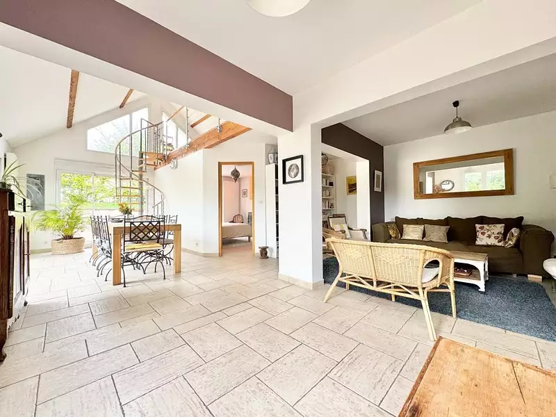 Au premier étage, un couloir dessert une grande pièce de vie lumineuse de 42.63 m² avec accès direct sur la terrasse offrant différentes expositions, une cuisine semi ouverte grâce à des portes à galandage, une mezzanine aujourd'hui aménagée en salle de jeux, une salle d'eau, un wc indépendant, trois chambres.