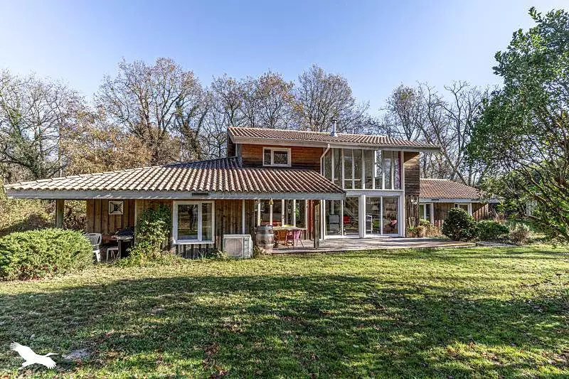 Au Pian médoc, belle maison d'architecte sur 4000m² de parcelle boisée au calme. Elle propose une entrée, un séjour lumineux avec un poêle à bois, une cuisine équipée, cinq chambres dont une suite parentale, une salle d'eau, un bureau, deux wc et une buanderie. Un double carport complète ce bien situé à proximité des commodités.