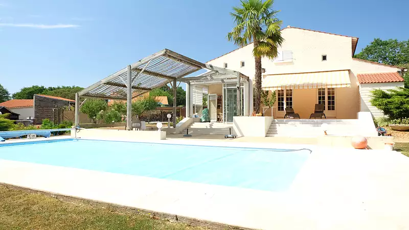 A seulement quelques minutes de La Roche-sur-Yon, cette propriété unique allie raffinement, fonctionnalité et sérénité, dans un environnement préservé sans aucun vis-à-vis. L'architecture, les volumes, la lumière et les extérieurs soignés en font un bien d'exception, pensé pour une vie familiale fluide, indépendante et résolument tournée vers le confort. Un intérieur lumineux, structuré et harmonieux Dès l'entrée, le hall avec vestiaire donne le ton : espaces généreux, circulation fluide, finitions soignées. En rez-de-chaussée : ? Une suite parentale climatisée avec salle d'eau privative ? Une deuxième chambre, idéale pour un jeune enfant ou un bureau calme ? Un vaste salon-séjour traversant, baigné de lumière ? Une cuisine indépendante aménagée et équipée, prolongée par une buanderie fonctionnelle A l'étage : ? Deux chambres supplémentaires ? Un bureau confortable, une grande mezzanine ouverte ? Une seconde salle d'eau avec WC, parfaitement répartie pour une vie de famille Des extérieurs à la hauteur des plus belles propriétés Le parc de plus de 6000 m² clos, arboré et sans vis-à-vis est un véritable havre de paix : Piscine 10 x 5 m exposée plein sud, avec pool-house et pergola en bois exotique Véranda et cuisine d'été aménagées pour recevoir en toute saison Potager, verger, maison dans les arbres, poulailler Arrosage automatique performant, alimenté par le puits, avec 23 buses réparties sur la propriété Double garage carrelé, atelier, local isolé et chauffé, bâtiment bois de rangement, bûcher pour le bois de chauffage Portail motorisé, accès soigné, stationnements multiples Confort et technologie Chauffage par pompe à chaleur, climatisation dans la suite parentale Fibre internet, classe énergétique B Maison parfaitement entretenue ? aucun travaux à prévoir Un lieu de vie rare et confidentiel, où tout a été pensé pour conjuguer esthétique, confort moderne et cadre de vie naturel. Idéal pour une famille en quête d'espace, de sérénité et de qualité de vie, à proximité immédiate des services et des axes. Visite uniquement sur dossier ? une propriété de caractère à découvrir en toute discrétion. (4.08 % honoraires TTC à la charge de l'acquéreur.)