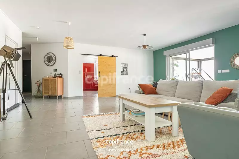 Dès l'entrée, les volumes impressionnent. Le salon-séjour, prolongé d'une véranda chauffée, compose un espace de vie de plus de 75 m², baigné de lumière et tourné vers le jardin. Une cuisine contemporaine, entièrement aménagée et équipée, s'ouvre en demi-teinte grâce à une élégante porte atelier, mêlant fonctionnalité et style.