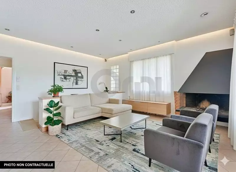 Au rez-de-chaussée, profitez d'un vaste salon / salle à manger avec cheminée, ouvrant de plain-pied sur deux terrasses : l'une couverte, idéale pour les repas en toute saison, et l'autre à l'air libre, parfaite pour les moments de détente ensoleillés.
