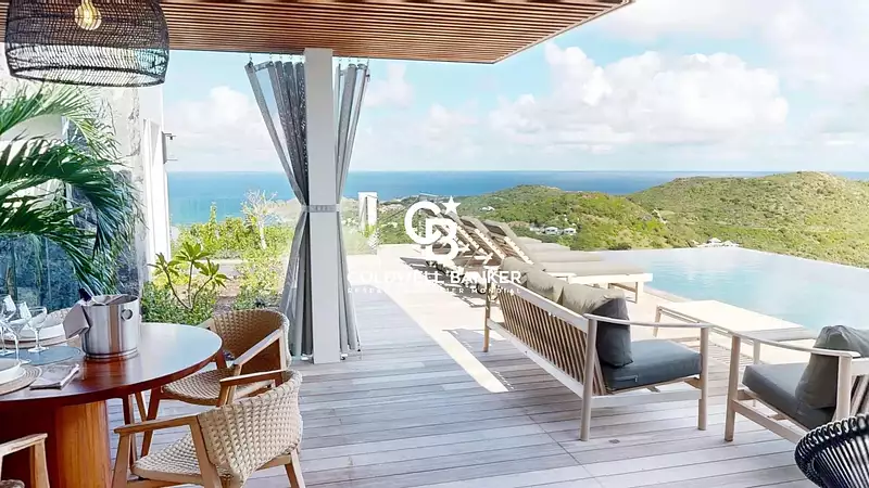 Villa aux lignes contemporaines, située sur les hauteurs de Devet, à l’endroit où le paysage s’ouvre entièrement sur l’océan. Face à elle, l’horizon embrasse la baie de Petit Cul-de-Sac, les eaux sauvages de Toiny et les nuances infinies du bleu. Chaque lever de soleil illumine la scène, transformant le panorama en tableau vivant.