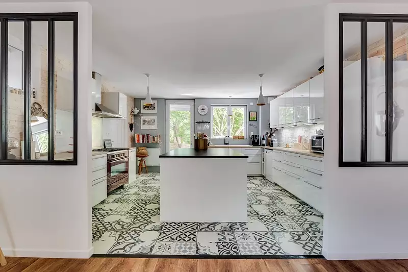 Rénovée en 2016, elle se compose au rez de chaussé d'une grande entrée dégagée, d'une pièce de vie principale traversante avec cuisine ouverte entièrement équipée, d'un salon TV indépendant, d'un bureau (ou chambre de plain pied) et d'une salle de bain avec wc.