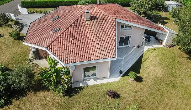 Un spacieux hall d'entrée ouvrant sur un séjour de 40 m² profitant d'une cheminée insert en position centrale et des ouvertures sur le jardin offrent à cet espace de jour une ambiance chaleureuse avec une vue sur la nature et sur la chaîne des Pyrénées. Une cuisine de 16 m² aménagée alliant confort et fonctionnalité permet d'accéder aux terrasses exposées SUD-EST, une chambre, un dressing, une grande salle de bains et WC séparé. Un escalier en TRAVERTIN permet l'accès à l'étage où l'on peut découvrir la structure de la charpente et trois chambres de belles dimensions, un bureau, une salle d'eau et un WC. Un espace de 40 m² a été aménagé et permet de laisser libre cours à vos projets. Un grenier. Un double garage de 40 m² avec une buanderie.