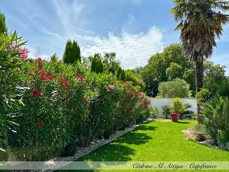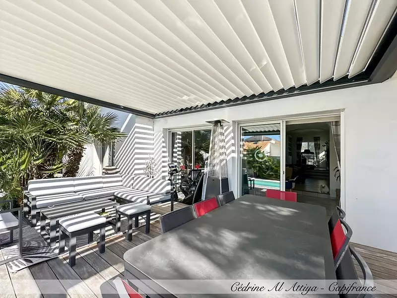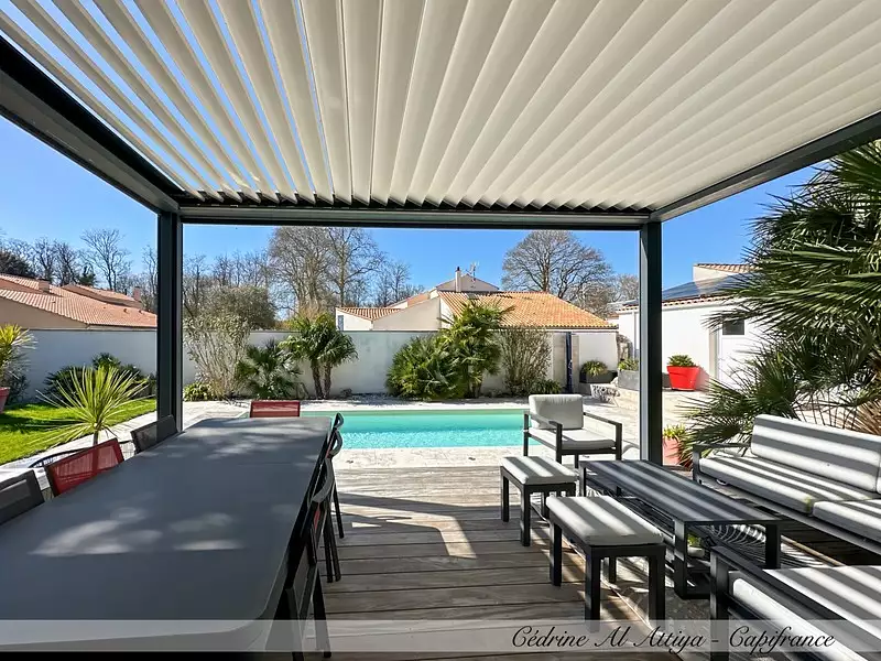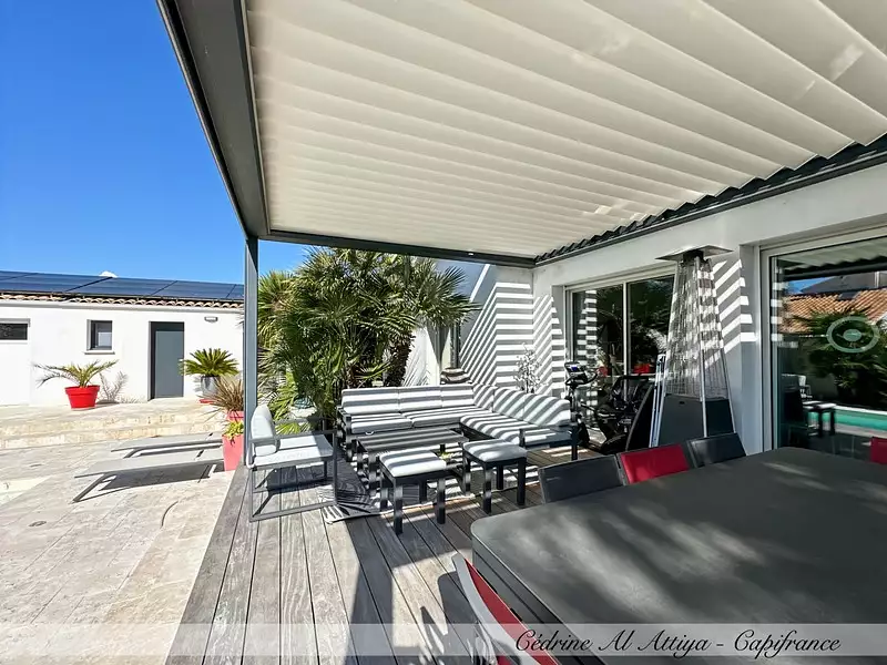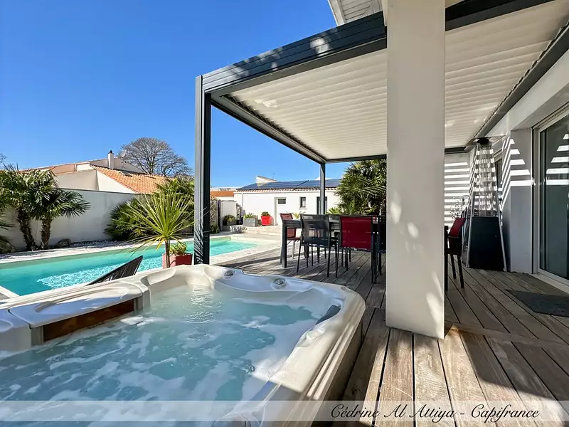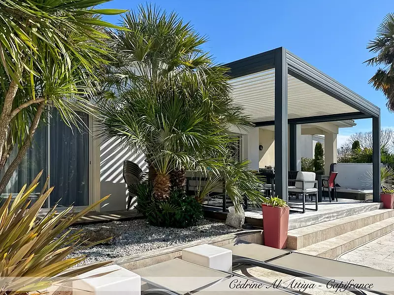 Le jardin arboré offre un cadre verdoyant agréable, complété par une piscine au sel de 3,50 x 10 m équipée d'un volet immergé pour la sécurité. Une terrasse en bois exotique et une pergola bioclimatique permettent de profiter de l'espace extérieur en toute saison. Un spa vient compléter cet ensemble dédié à la détente et à la convivialité sans oublier le terrain de pétanque.