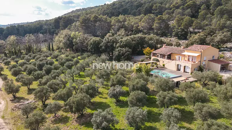 À Villecroze, charmant village de Provence, cette propriété rare se niche dans un quartier recherché, au cœur d’un environnement d’une quiétude absolue. Le terrain, d’une superficie exceptionnelle de 27 198 m2, s’étend entre collines et restanques, planté de 230 oliviers qui dessinent un paysage typiquement méditerranéen. La maison de plain-pied d'environ 188 m2 s’intègre harmonieusement dans ce décor bucolique, baignée de lumière et tournée vers la nature. Dès l’entrée, on accède à un vaste séjour de 75 m2 avec cuisine ouverte, cheminée en pierre et poêle à bois, lieu de vie chaleureux et convivial, s’ouvrant sur une large terrasse couverte d’où l’on contemple la beauté des collines environnantes. La suite parentale, avec salle de bain et WC, bénéficie d’un accès direct à la terrasse, tout comme la seconde chambre en suite. Deux autres pièces, utilisées aujourd’hui comme bureau et buanderie, peuvent aisément être aménagées en chambres supplémentaires selon les besoins. Un cabanon de 23 m2, alimenté en eau et électricité, attend d’être restauré pour devenir un espace de charme supplémentaire. L’ensemble est complété par un grand double garage, un double abri voiture, un atelier en rez-de-jardin, et une superbe piscine de 11 x 5 m, nichée au cœur de ce paysage provençal où le temps semble suspendu. L’eau de la ville, combinée à un forage, assure l’autonomie et la sérénité de ce lieu enchanteur. Une propriété hors du temps, idéale pour les amoureux de nature, de silence et de lumière.