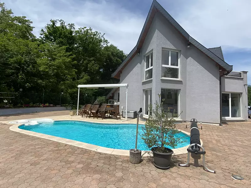 Chauffage au sol, climatisation, PAC par géothermie, panneaux photovoltaiques. Garage double avec atelier, terrain pavé et clôturé, portail motorisé. Piscine waterair. Construction de qualité, excellent état général, vivable de plain-pied. La maison est idéalement située proche des axes autoroutiers, écoles et commerces.