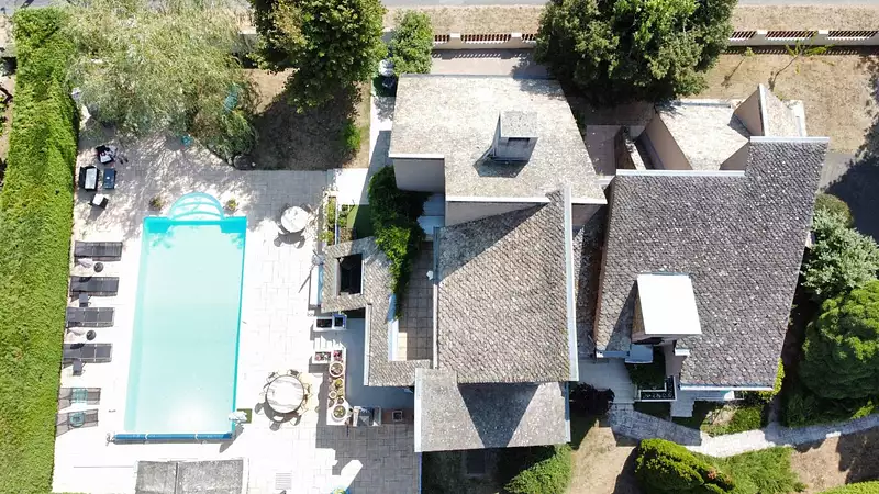 Dès l'entrée, la pièce de vie aux volumes généreux s'ouvre sur une vaste terrasse baignée de lumière et sur la piscine, créant une parfaite harmonie entre intérieur et extérieur.