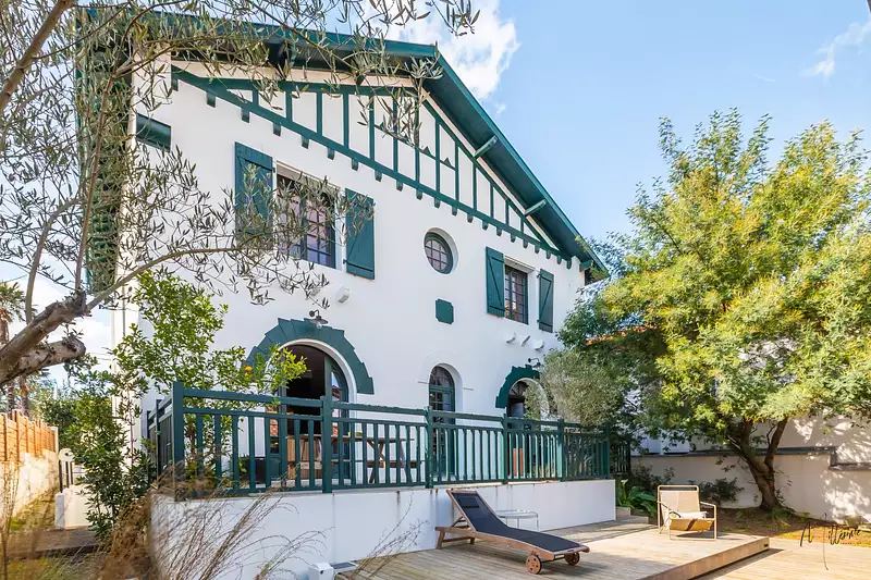 Située à proximité des commerces dans une jolie rue résidentielle, superbe néo-basque entièrement rénovée avec goût et matériaux de qualité sur une ravissante parcelle arborée.