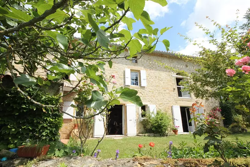 Propriété en campagne sur un terrain de 730 m2 paysagé et arboré, caractère et charme. Endroit calme et bucolique avec magnifique vue sur les Pyrénées.