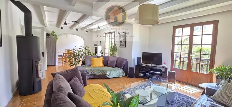 Grand séjour triple ouvert sur jardin arboré, exposé Sud, disposant d'un poêle à bois.